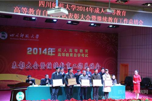 继续教育工作始于1984年,走过三十年的历程,继续教育工作得到不断发展。丁任重校长宣读了《四川师范大学关于表彰2014年成人高等教育、高等教育自学考试评优活动的获奖名单》,我院获得了“先进集体”荣誉称号,李久军老师获得自学考试助学工作先进个人荣誉称号,段丽琼、魏婷两位老师获得了优秀自考助学工作教师荣誉称号。